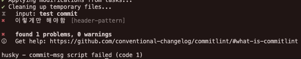 이렇게 규칙을 추가해주고 해당 규칙에 맞지 않는 커밋 메세지를 설정하면 정상적으로 진행되지 않고 막힌다.